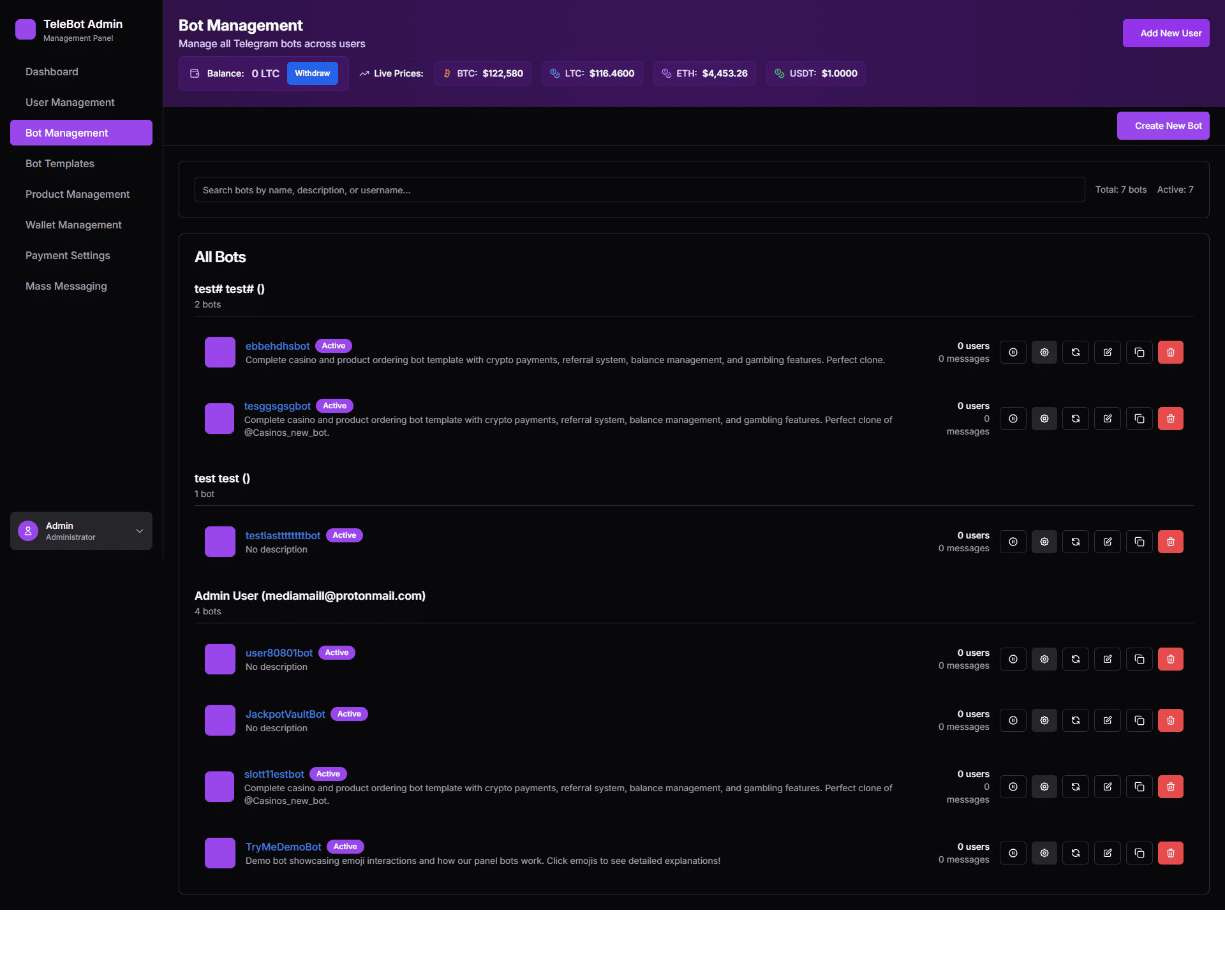 Allows users to create and clone custom Telegram bots with full category/city controls, separate databases, and mass messaging. Includes integrated payment system and unlimited cloning options.